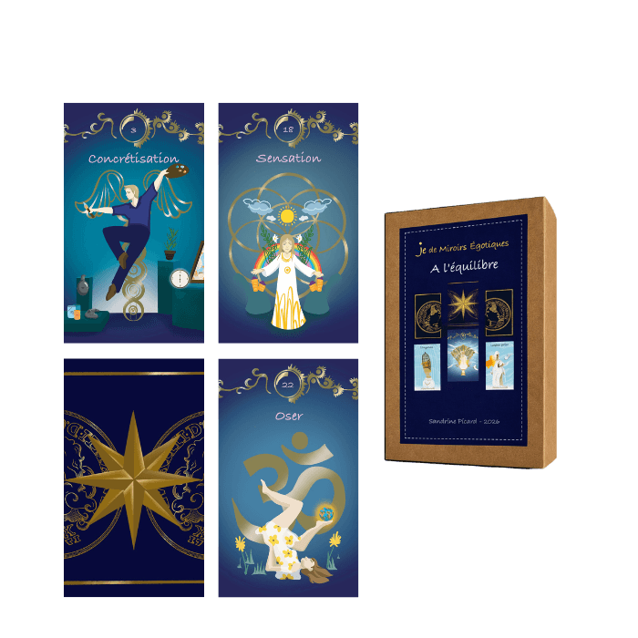 Créé à partir de mon propre chemin initiatique — celui d’un effondrement de l’ego — ce jeu m’a guidée vers la clarté, la simplicité et la réconciliation avec mes paradoxes.